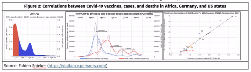 Igor TšudovNäiteks leiti, et vaktsineerimismäärad selgitavad 24 protsenti ülemäärasest suremusest 31 Euroopa riigis, mis on statistiliselt väga oluline. Diagrammid, mille on koostanud Fabian Spiker Toome kolm näidet, mis näitavad Covid-19 surmajuhtumite järskude tõusude ajalist seost Aafrikas, tugevat korrelatsiooni revaktsineerimise võimendajate ja Covid-juhtude vahel Saksamaal ning vaktsiinide esimeste dooside ja Covid-surmade vahel 50–64-aastaste naiste seas USA osariikides (joonis 2).
