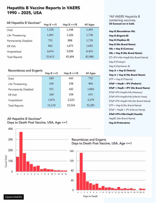 Ma küsisin sõdalastelt emadelt OpenVAERS (kes teevad tööd, mida peaks tegema CDC), et arvutada välja B-hepatiidi vaktsiinidest tingitud surmajuhtumite koguarv aastast 1990 kuni tänapäevani. Saadud tulemused näitavad, et B-hepatiidi vaktsiinid on inimsusevastane kuritegu.