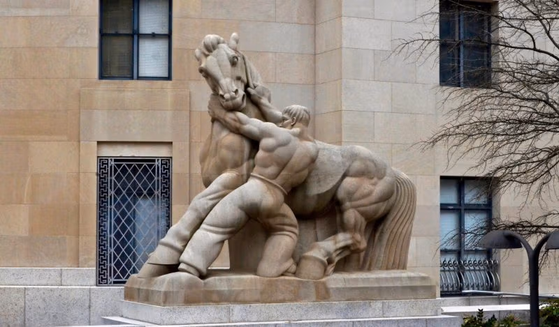 See kujutab meest, kes hoiab hobust tagasi. See on inimene vs loom, täiesti erinevad liigid ja täiesti erinevad huvid, üks nõuab edasiminekut ja teine hoiab seda tagasi. Skulptuuri eesmärk on ülistada valitsuse (inimese) rolli kaubanduse (tööstuse) kontrollimisel. Vastupidine seisukoht mõistaks valitsuse hukka tööstuse kontrollimise eest.