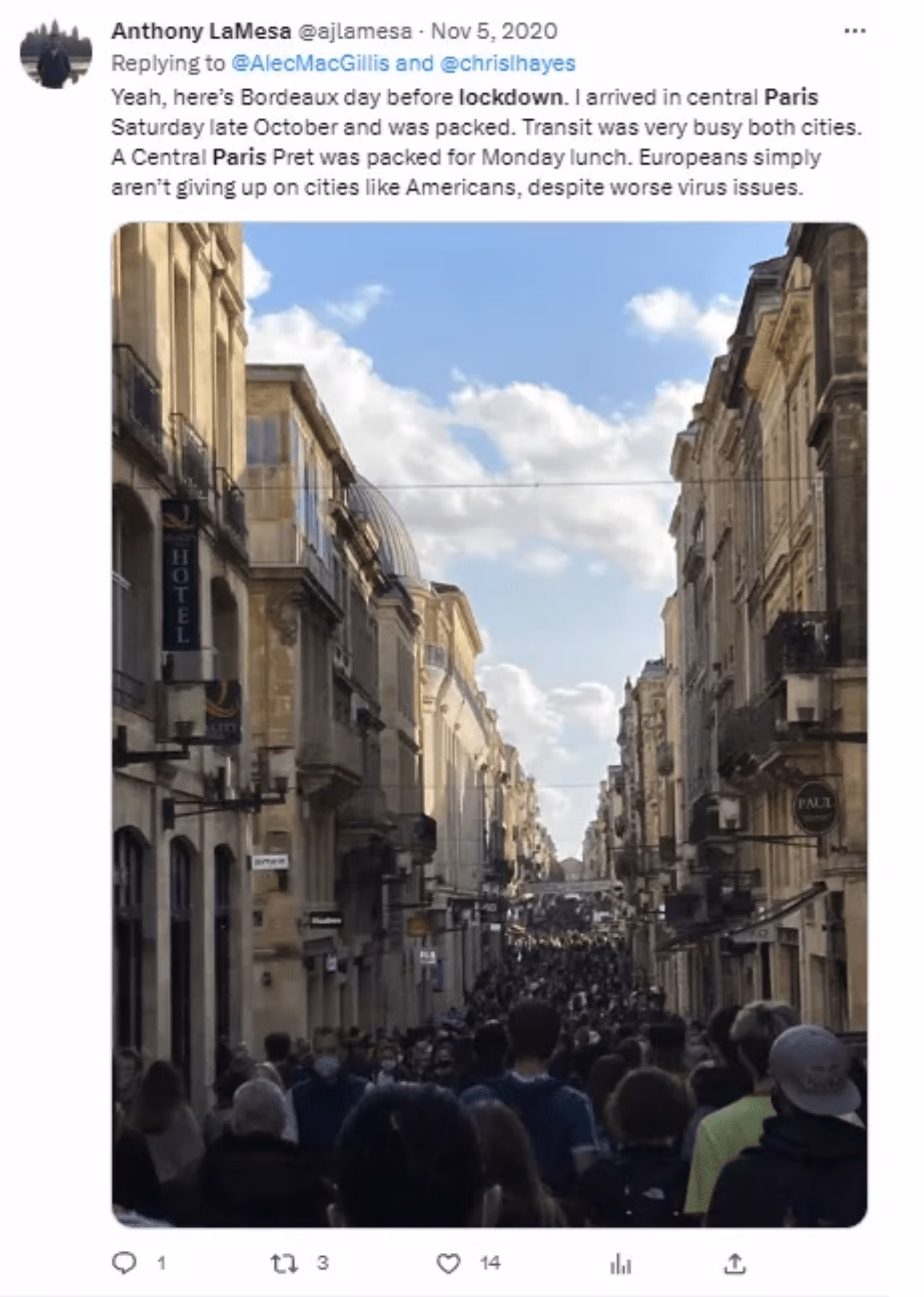 Näiteks nägi Prantsusmaal asuv Bordeaux' linn välja selline päev enne seda, kui Prantsusmaa kehtestas ühe läänemaailma rangeima sulgemise.