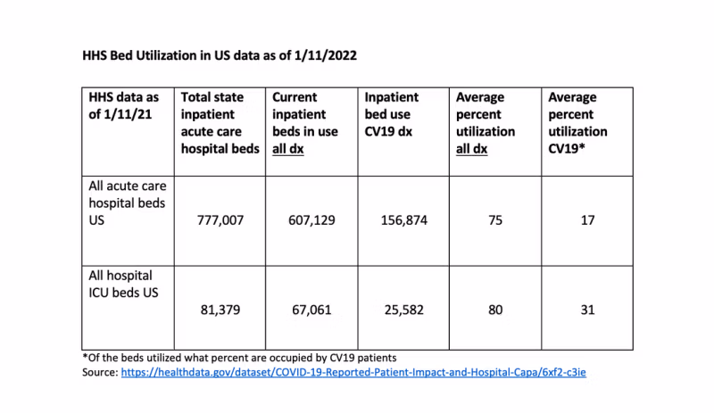 Need andmed on kogu riigi täiskasvanute koondandmed, mis on arvutatud osariikide koondandmete liitmise teel. Kindlasti leidub osariike, kus voodikohtade kasutamine kõigi haiguste ja CV19 puhul on suurem. Patsientide jaotus ei ole ühtlane, eriti linnahaiglates, kus kasum on tähtsam. Üldiselt ei tundu need riiklikud andmed nii sünged kui New York Timesile või dr Fauci ennustab seda nii.